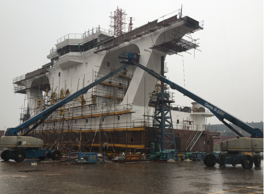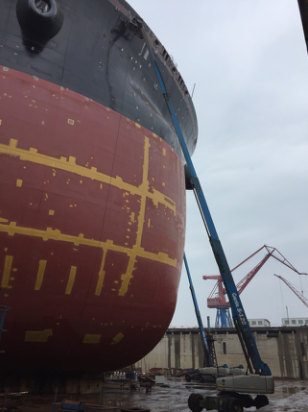 高空作业平台用途广,安全性能好,效率高,很适合船舶行业应用。据了解,以前为了完成货仓的涂装作业,施工人员常常要为搭建脚手架费尽心思,甚至需要50-60人耗费一天的工时才能完成。而自从引入吉尼高空作业车后,北海船厂的涂装、喷砂等业务都可以通过吉尼高空作业平台高效率地完成,工期大大缩短,操作的安全性也得到了很大地提升。盐雾空气、严重的氧化、焊渣、切割碎屑和连续高强度使用使得船厂成为高空车应用最恶劣的应用环境之一,对高空车设备的性能和质量都有着很高的要求。吉尼高空车经久耐用 ,使用寿命长,最老的一批吉尼设备到现在已将近有十多年的历史了, 至今还在正常使用。此外吉尼设备在设计上也很人性化,作业平台使用了高强度的方钢管和软垫保险杠,能有效地保护操作人员和防止碰撞。钢制平台回转器区域防护罩能防止焊渣和碎片堆积在平台软管、电线和液压旋转器上。发动机的设计独特且可以从底座旋转到车外,更便于维修与保养, 这也是吉尼有别于其他品牌独特的一个优势。