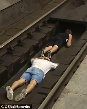 就在火车到达之前,两个胆大妄为的年轻人从地铁站的站台上跳下,躺在铁轨之间。