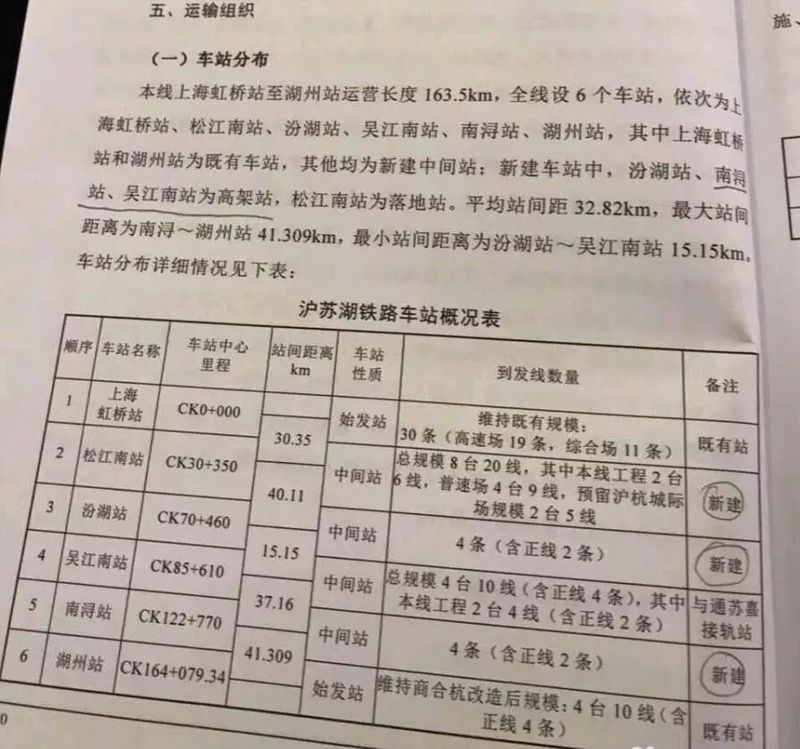 ▲沪苏湖高铁线路图 新建车站中 汾湖站、吴江南站、南浔站为高架站 平均站间距32.82km 最大站间距离为南浔~湖州站41.309km 最小站间距离为汾湖站~吴江南站15.15km