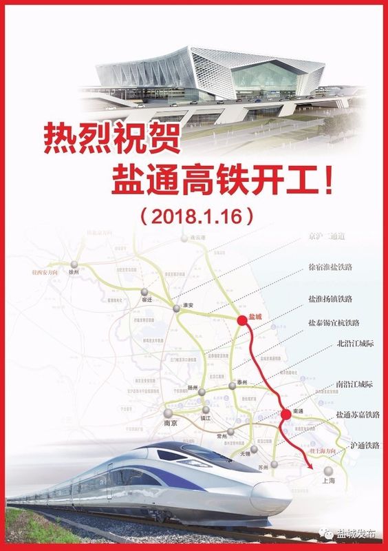 前段时间盐通高铁也开工了 1月16日,时速350公里/小时的盐通铁路正式开工。