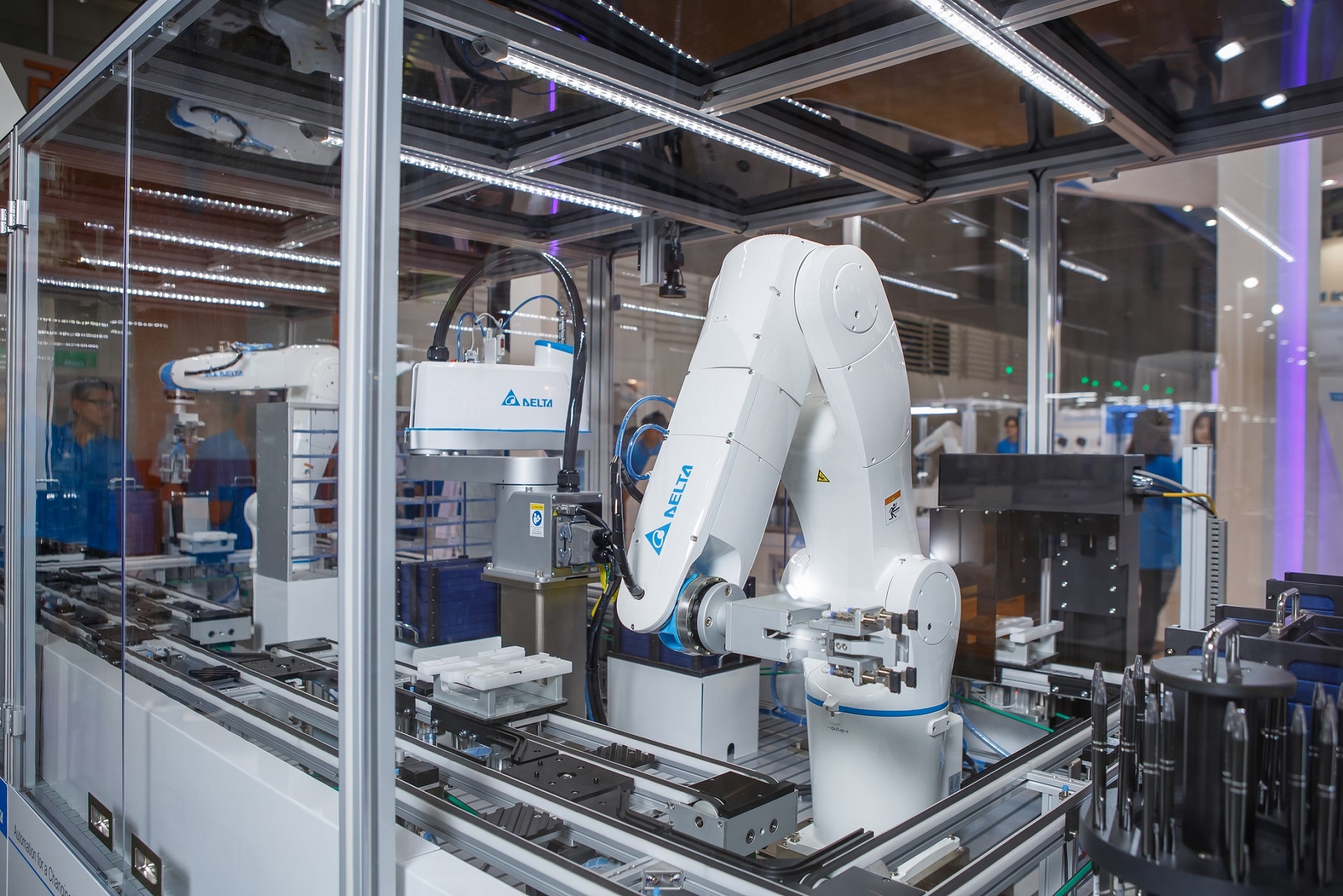 台达本次展出聚焦首度在台亮相的弹性多工智能产线。产线设备长达4米,现场模拟无人产线作业,客制激光雕刻礼品。来宾以计算机、平板或手机在制造执行系统(DIAMES)线上下单,并透过可视化管理平台,实时监看作业进度及设备运作数据;系统确认订单后,智能输送线将工件载具分流至不同的机器人工作站,分别执行工件取放、包装,最后完成礼品出货/入库等作业;来宾收到取货通知短信后,可透过台达影像读码器扫描短信QR Code,由机器人自动取货。透过整合台达软硬体设备,弹性多工智能产线串联客户订单、产线、和监控系统,让来宾体验高效、全自动、数字化的“未来智造”。