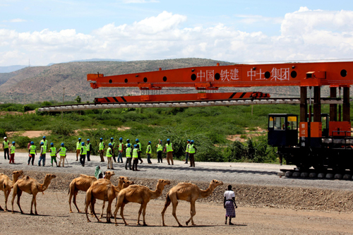 这是2014年4月27日中国铁建中土集团的工人在埃塞俄比亚德雷达瓦进行亚吉铁路先期铺轨作业的资料照片。亚吉铁路全长752.7公里,于2010年9月开始设计建造,设计时速120公里,由中国中铁和中国铁建组织施工。铁路建成后,亚的斯亚贝巴至吉布提运输时间从公路运输的7日降至10小时,这条铁路将成为埃塞俄比亚重要的出海运输通道。新华社发(刘渝 摄)