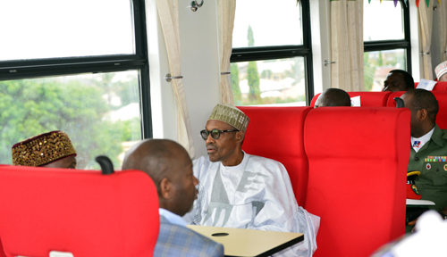 2016年7月26日,在尼日利亚首都阿布贾西郊伊都火车站,尼日利亚总统布哈里(中)试乘阿卡铁路客车。2006年10月,中土公司与尼日利亚签署尼日利亚铁路现代化项目。该项目南起尼最大城市、经济中心拉各斯,途经首都阿布贾,北至北部重镇卡诺,线路全长1315公里。阿卡铁路于2011年开工建设,并于2016年7月正式运营通车。新华社发(杨鸿杰 摄)