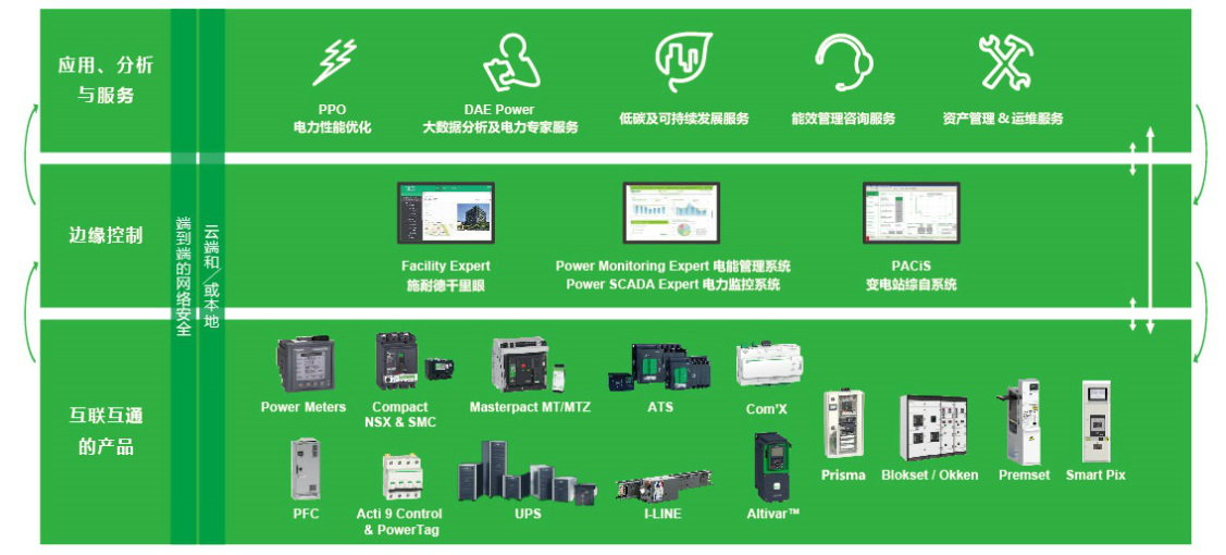 施耐德电气EcoStruxure配电利用在互联互通的产品,边缘控制,以及应用、分析和服务三个层面的创新,形成从连接、收集到分析、行动的闭环智能配电新架构,覆盖数据中心建设和运行所有电力领域和管理链各个环节,通过开放式集成、实时操作分析以及更高级别的网络安全,帮助用户充分利用智能化和数字化的新机遇,实现更安全可靠、高效、可持续性和互联互通。
