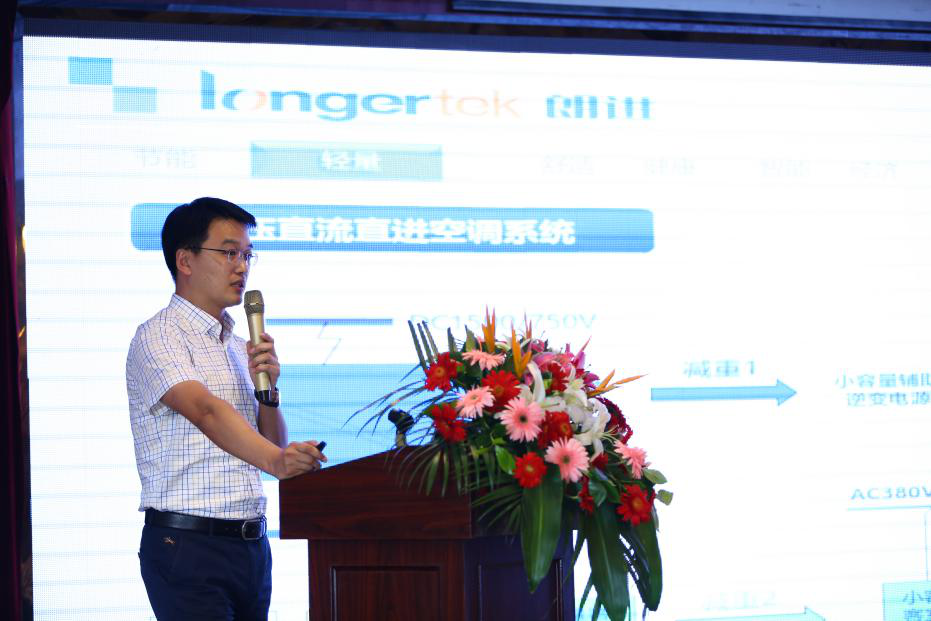 山东朗进科技股份有限公司董事长助理、副总经理王绅宇作“新一代节能环保、智能舒适、轻量减重型轨道车辆空调系统及延伸技术”的主题演讲。
