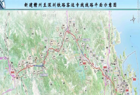 据了解,赣深高铁线路全长约432公里,共设车站14座,其中江西境内约133.9公里,设有信丰西、龙南东、定南西3个新建车站。赣深高铁自(南)昌赣(州)高铁赣州西站引出,经我省赣州市南康区、信丰县、龙南县、定南县,广东省河源市、惠州市、东莞市,终抵深圳北站。该线北连昌赣高铁、赣瑞龙铁路、渝长厦铁路等,并向北延伸至北京,中部接广梅汕铁路、广汕铁路,南衔厦深铁路、广深港客专、深茂铁路。该线计划建设工期48个月,建成后将形成继京广深(港)、京沪等纵向铁路通道后,又一条连通南北的大能力快速客运通道。建成通车后,南昌至深圳的铁路旅行时间将由现在(经沪昆、京广高铁)最快5个多小时压缩至3个多小时,赣州至深圳将由现在(经京九铁路)最快6个多小时压缩至2小时内。