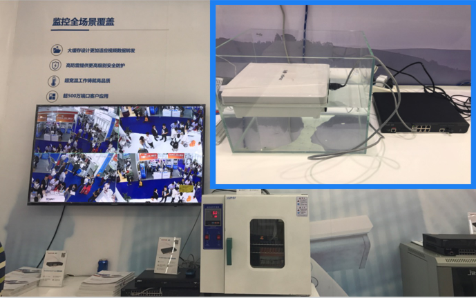 在展台前放置的工业烤箱中,一款低端安防监控交换机正在温度高达60度的烤箱内正常运行,转发高清视频画面丝毫无卡顿。而在景区无线解决方案的展台前,AP被工作人员浸泡在鱼缸内,却照样可以工作,充分体现了AP设备应对恶劣环境的良好性能。