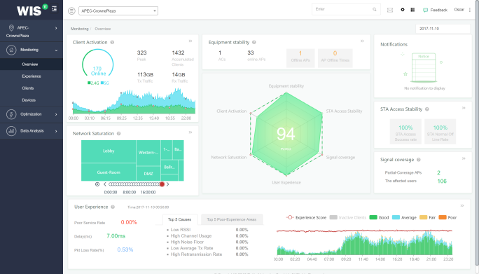 锐捷的无线服务团队使用了WIS无线智能优化系统,利用WIS智能采集、分析引擎、精确诊断、智能优化等功能,对酒店内无线终端的大量数据进行分析,彻底解决了酒店之前反映的“频繁漫游、重复掉线、反复认证”等Wi-Fi应用痛点,最终全面满足了APEC期间的酒店网络需求。