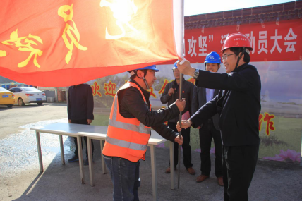 四公司工会刘和轩主席在动员会上为项目部党员突击队、青年突击队授旗并讲话,要求项目部全体共产党员和共青团员要发挥模范带头作用,以强烈的责任担当,求真务实的工作作风,认真履职尽责,坚决打好打赢安全质量文明施工及大气污染防治“百日攻坚”这场硬仗,同时全力以赴完成业主下达的各项节点目标,为企业树立良好品牌形象、进一步开拓合肥市政建设领域奠定坚实的基础,为合肥人民交上一份完美的答卷。