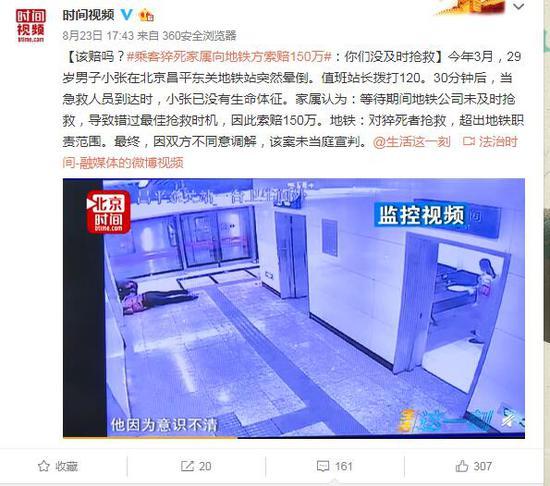 [该赔吗?#乘客猝死家属向地铁方索赔150万#:你们没及时抢救]今年3月,29岁男子小张在北京昌平东关地铁站突然晕倒。值班站长拨打120。30分钟后,当急救人员到达时,小张已没有生命体征。家属认为:等待期间地铁公司未及时抢救,导致错过最佳抢救时机,因此索赔150万。地铁:对猝死者抢救,超出地铁职责范围。最终,因双方不同意调解,该案未当庭宣判。