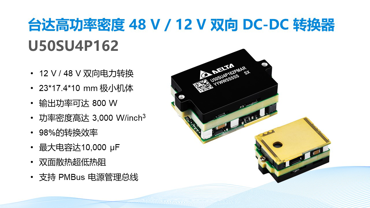 在电力转换的部份,台达DC-DC转换器U50SU4P162可实现 12 V 与48 V 的双向DC-DC电力转换。