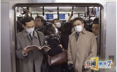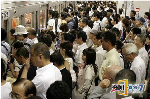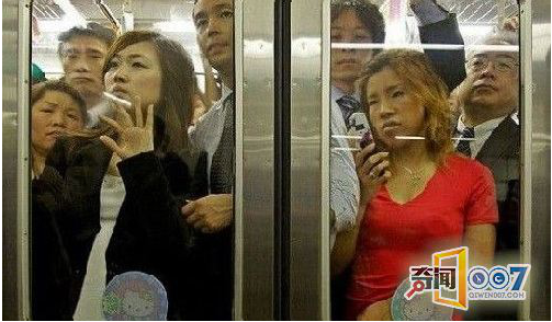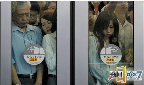 可怜的女孩,被贴在玻璃上。日本的妇女地位很低,因此挤地铁时男人没有谦让的习惯。因此七十年代发生了好几起妇女被挤伤事件。由于过于拥挤,地铁为了保护女士和儿童专门开设了妇女专用车厢。后来这个车厢撤销了。