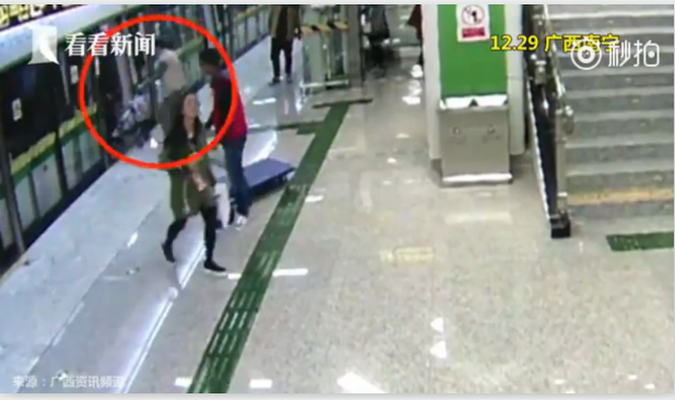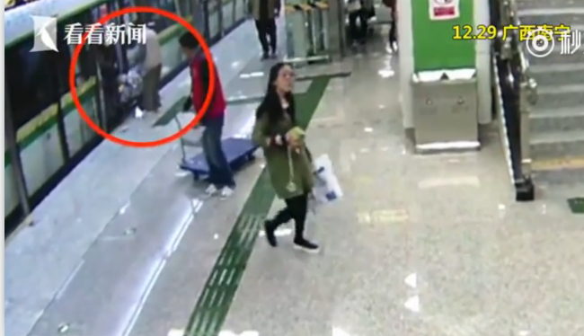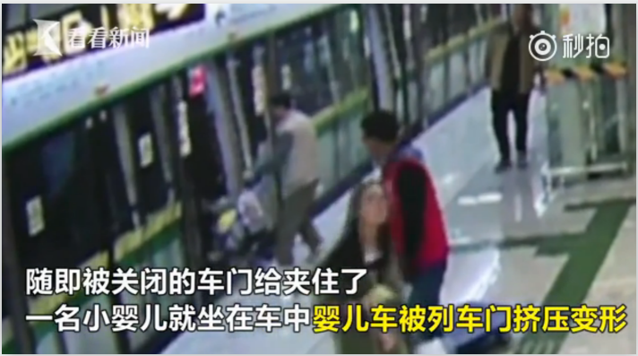 12月29日上午9点50分,在广西南宁,一辆地铁列车抵达民族广场站,就在车门即将关闭时,一名男子推着一辆婴儿车冲了上去,被关闭的车门给夹住了。